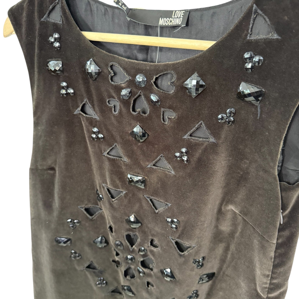 The perfect outfit for a big night out on the town by way of the Love Moschino black velvet dress, the self applique and beading in front adds a subtle yet elegant touch.